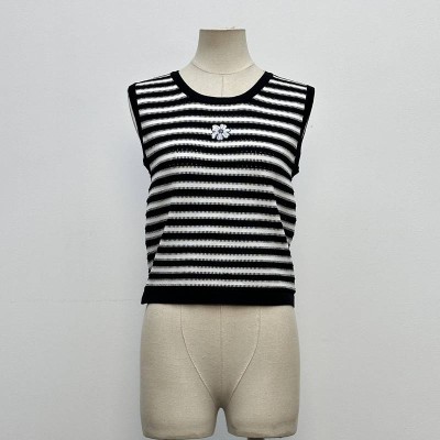 Black & White Striped Bead-Embellished Sleeveless Knitted Tank Top