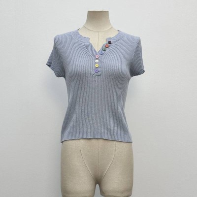 Light Blue Ribbed Knit Short-sleeve V-neck Cropped Top With Colorful Buttons Slim Fit Knitwear