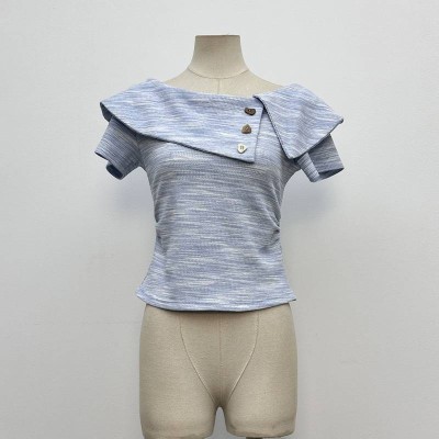 Blue White Mixed Color Off-Shoulder Lapel Short Top Slim Fit Short Sleeve Knit Top