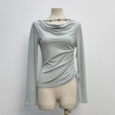 Grey-blue Draped Neck Drawstring Long-sleeve Top Slim Fit Inner Base Shirt