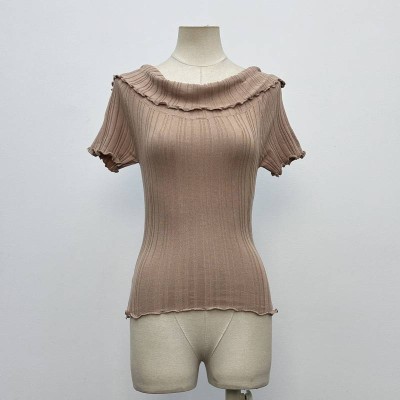 Gentle Off-the-shoulder Ruffle Short-sleeve Knitwear Slim-fit Ribbed Top