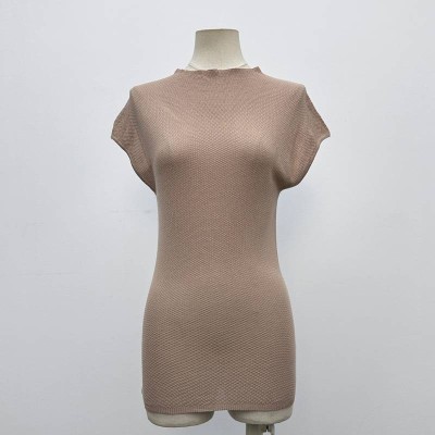 Elegant Mock Neck Short Sleeve Ribbed Knit Top Slim Fit Solid Color Basic Top
