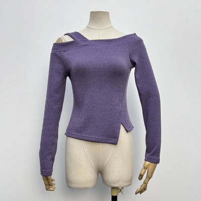 Vintage Purple Off-the-Shoulder Asymmetrical Neck Knitwear Slim Long Sleeve Irregular Hem Top