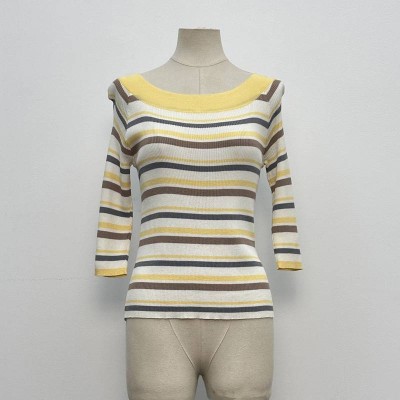 Striped Boat Neck 3/4 Sleeve Knit Top Color Block Slim Fit Base Shirt