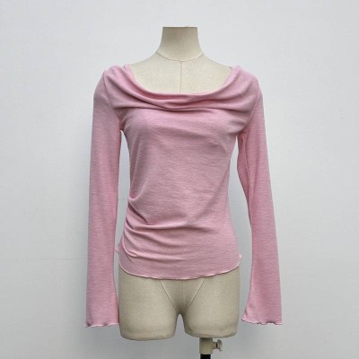 Pink Cowl Neck Long Sleeve Knit Top Slim Fit Ruffled Bottoming Blouse