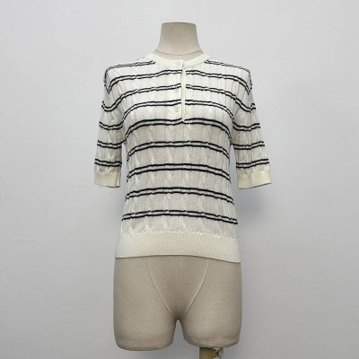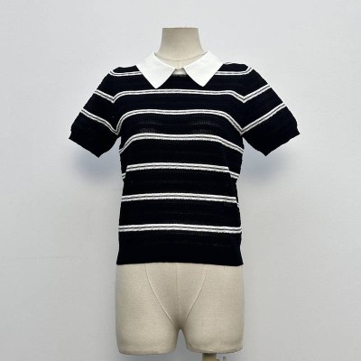 Fresh Blue-black Striped Polo Collar Short-sleeve Knitted Top