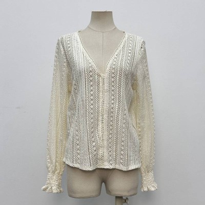French Hollow V-neck Long Sleeve Knit Top Gentle Style Loose Slim Blouse