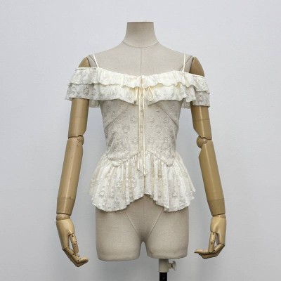 Gentle Style Off-the-shoulder Camisole Waist-cinching Top Ruffled Lace Short Blouse