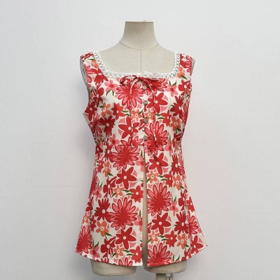 Vintage Red Floral Lace Square Neck Sleeveless Printed Top Waist Tie Sweet Vest