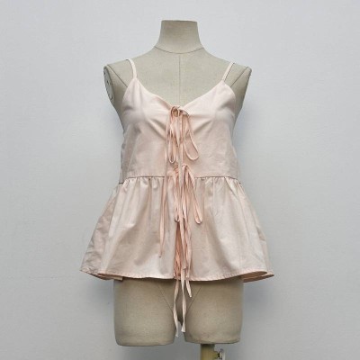 Gentle Pink V-neck Drawstring Camisole Ruffled Sleeveless Top