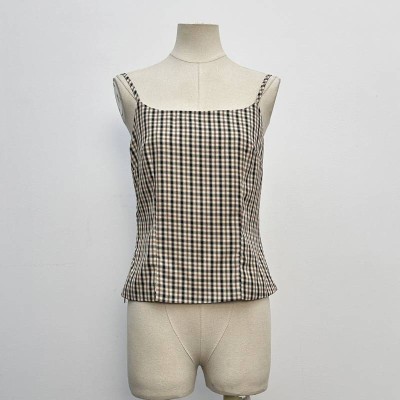Vintage Plaid Slim Camisole Simple Square Neck Sleeveless Inner Top