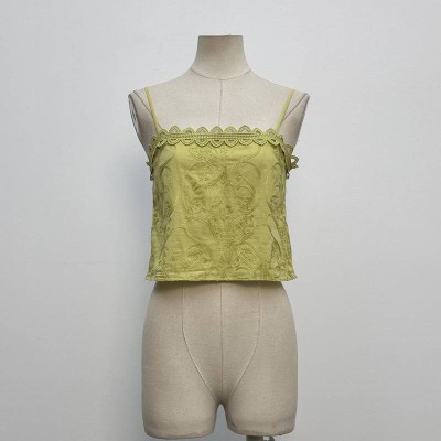 Vintage Embroidered Lace Trim Cropped Cami Top, Avocado Green Navel-exposed Inner Wear