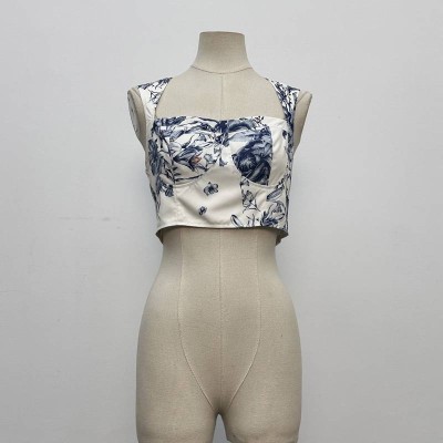 Blue and White Porcelain Style Printed Short Camisole Cropped Slim Sleeveless Top