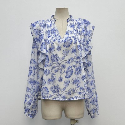 Blue and White Floral V-neck Ruffle Long Sleeve Chiffon Blouse