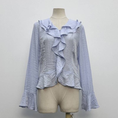 Light Blue Ruffled V-neck Long Sleeve Chiffon Shirt Gentle Style Age-reducing Breathable Blouse