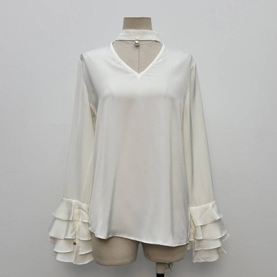 White V-neck Halter Ruffled Long Sleeve Chiffon Blouse