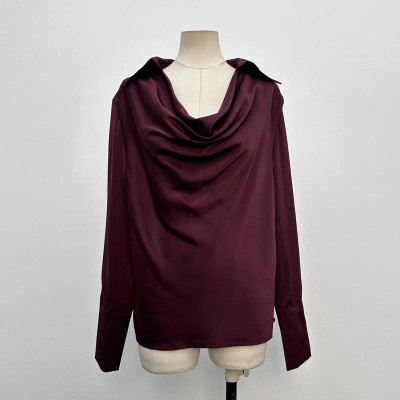 Wine Red Satin Cowl Neck Long Sleeve Elegant Top