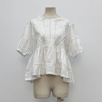 White Embroidered Lace Patchwork Puff Sleeve Top Loose Babydoll Chiffon Blouse