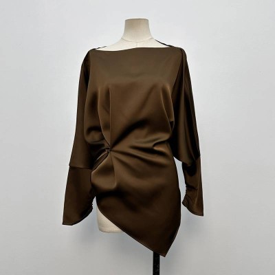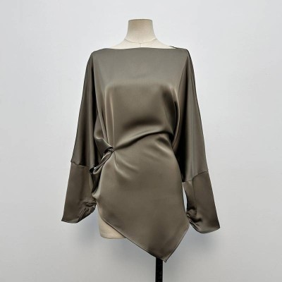 High-end Satin Batwing Sleeve Waist Cinched Top Niche Design Irregular Hem Long Sleeve Top