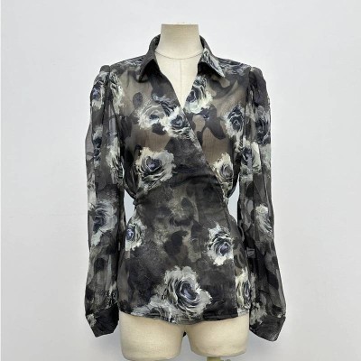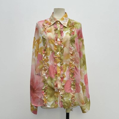 Vintage Blurred Floral Ruffled Chiffon Shirt Elegant Lapel Long Sleeve See-Through Top