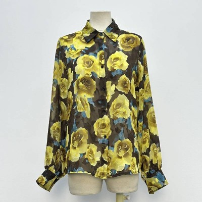 Vintage Yellow Rose Print Lapel Chiffon Shirt Long Sleeve See-through Temperament Top