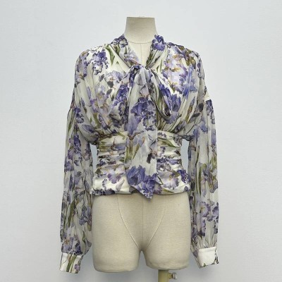 Iris Print Tie Waist Chiffon Long Sleeve Top