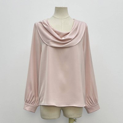 Elegant Satin Cowl Neck Long Sleeve Chiffon Top with Pearl Decor Loose Blouse