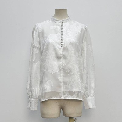 White Stand Collar Jacquard Chiffon Long Sleeve Shirt Elegant Semi-sheer Commute Blouse