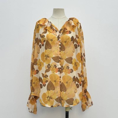 French Retro Yellow Floral Print Chiffon Blouse Ruffled Collar Loose Long Sleeve Sheer Top