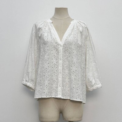 White Hollow Embroidery V-neck Long Sleeve Loose Top