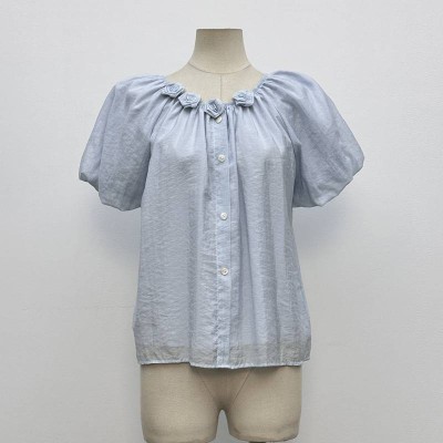 Light Blue Puff Sleeve Off-Shoulder Top Niche Floral Decor Chiffon Short Sleeve Blouse