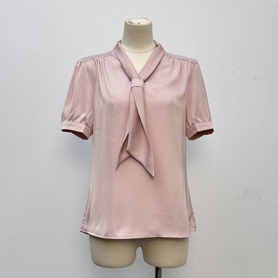 Pink Ribbon Short-sleeved Satin Chiffon Shirt Temperament Commuter Tie-up Blouse