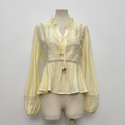 French Gentle Style Light Yellow Lace Tie Waist Long Sleeve Chiffon Blouse