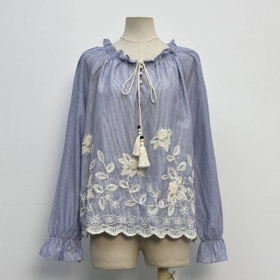 Blue and White Striped Embroidered Tie-neck Long Sleeve Loose Blouse