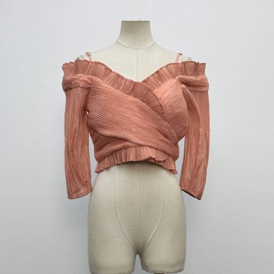 Elegant Off-the-shoulder Pleated Chiffon Cropped Top Spaghetti Strap V-neck Waist-fitted Slimming 3/4 Sleeve Top
