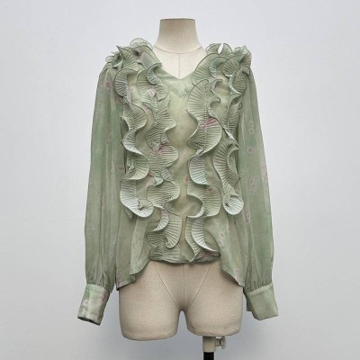 Mint Green Ruffle Chiffon Blouse, Elegant V-neck Long Sleeve Sheer Top