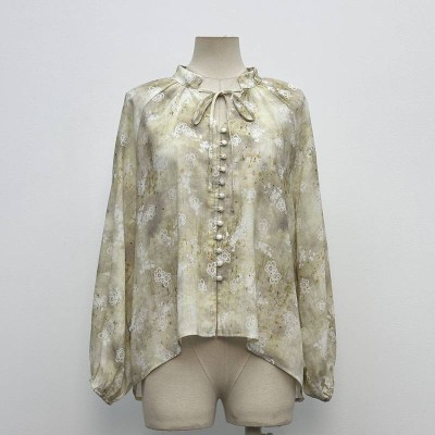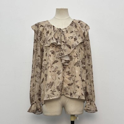 French Floral Tie Ruffle Long Sleeve Chiffon Blouse Gentle Style Loose Top