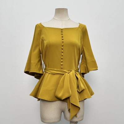 Mustard Yellow Square Neck Flare Sleeve Waist Tie Slim Fit Blouse