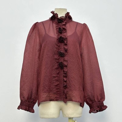 Burgundy Ruffled 3D Rose Long Sleeve Chiffon Shirt Gentle Style Sheer Layering Top
