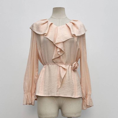 Gentle Pink Ruffled Waist-Tie Long Sleeve Chiffon Blouse