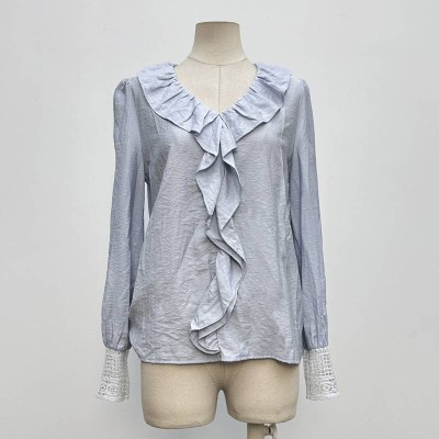 Light Gray V-neck Ruffled Long-sleeve Top Lace Cuff Elegant Chiffon Blouse