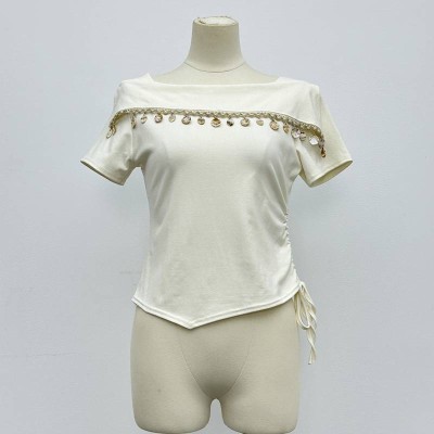Exquisite Diamond-Embellished Off-Shoulder Cropped Top Side Drawstring Slim Fit Short-Sleeve Top