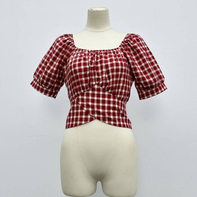 Vintage Red White Plaid Square Neck Puff Sleeve Cropped Waist Top
