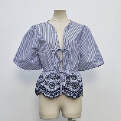 Blue and White Striped Tie-front Puff Sleeve Embroidered Cropped Top