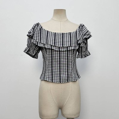 Vintage Plaid Off-the-shoulder Ruffle Short Sleeve Cropped Top