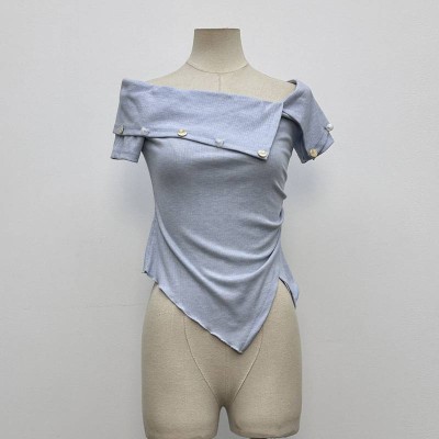 Designer Light Blue Off-the-shoulder Irregular Hem Short-sleeve Top