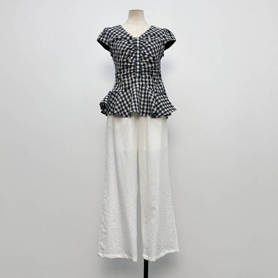 Vintage Gingham Ruched Ruffle Short Sleeve Top + White Wide Leg Pants Set