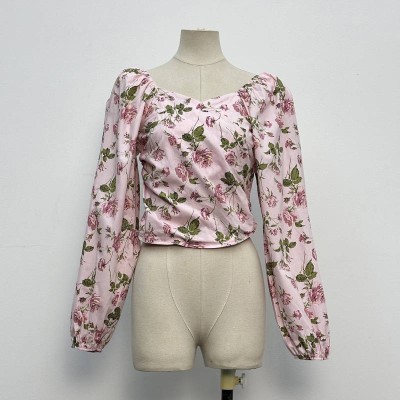 French Floral Square Neck Cropped Waist-cinched Long Sleeve Chiffon Blouse