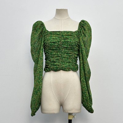 French Square Neck Floral Ruched Cropped Top Green Puff Sleeve Chiffon Blouse
