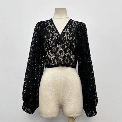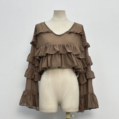 V-neck Ruffled Cropped Chiffon Top Long Sleeve Loose Elegant Slim Blouse